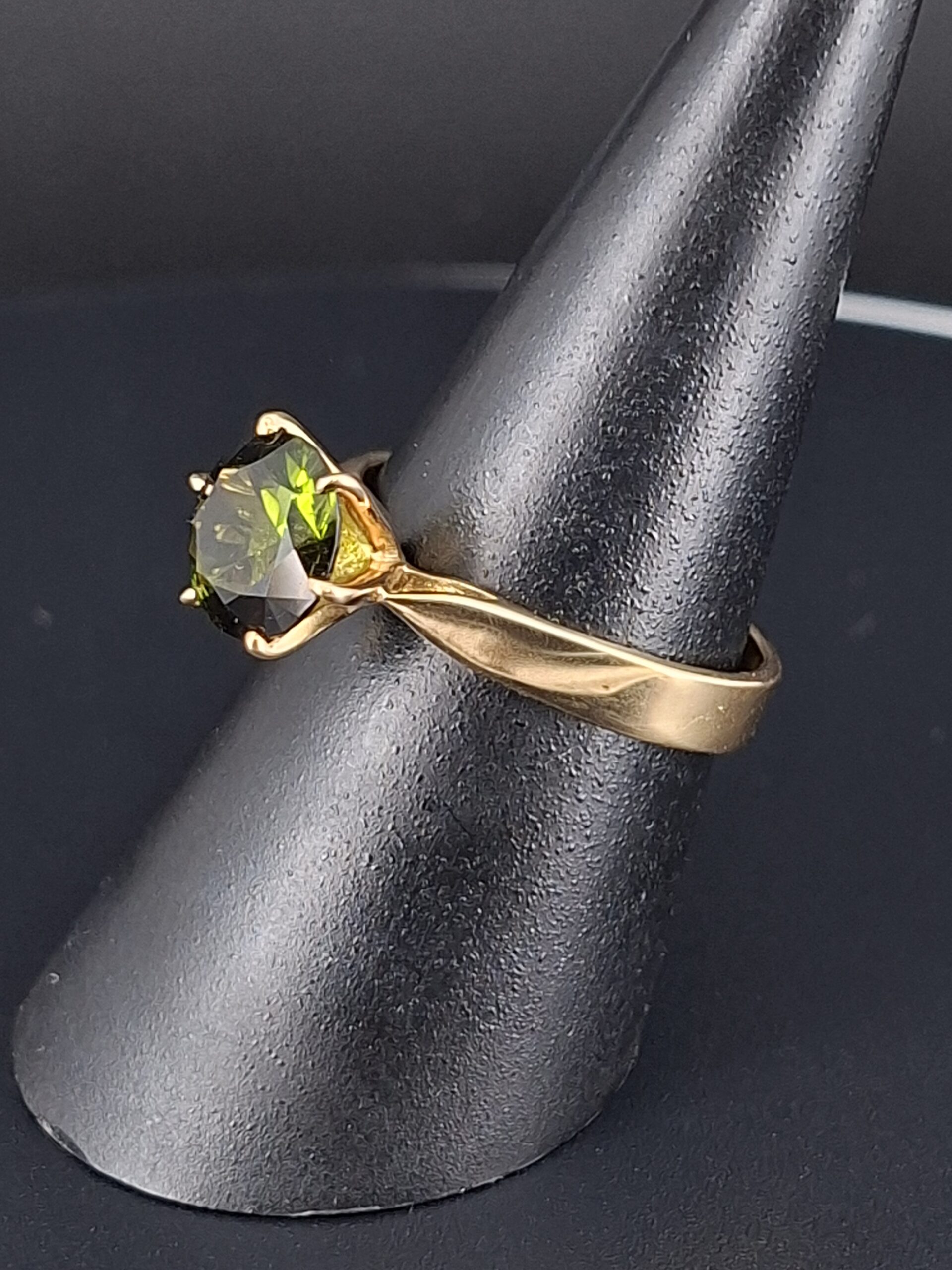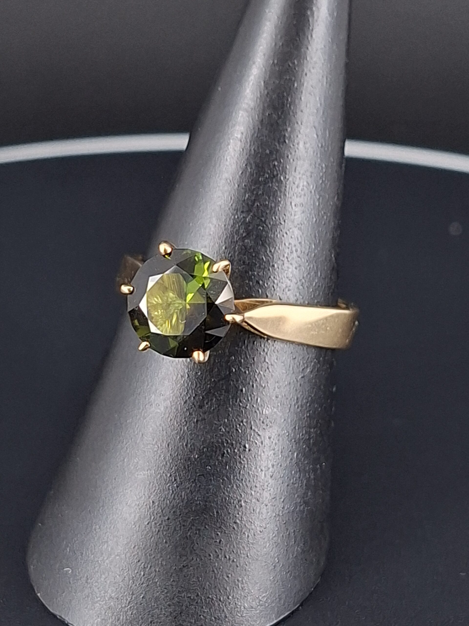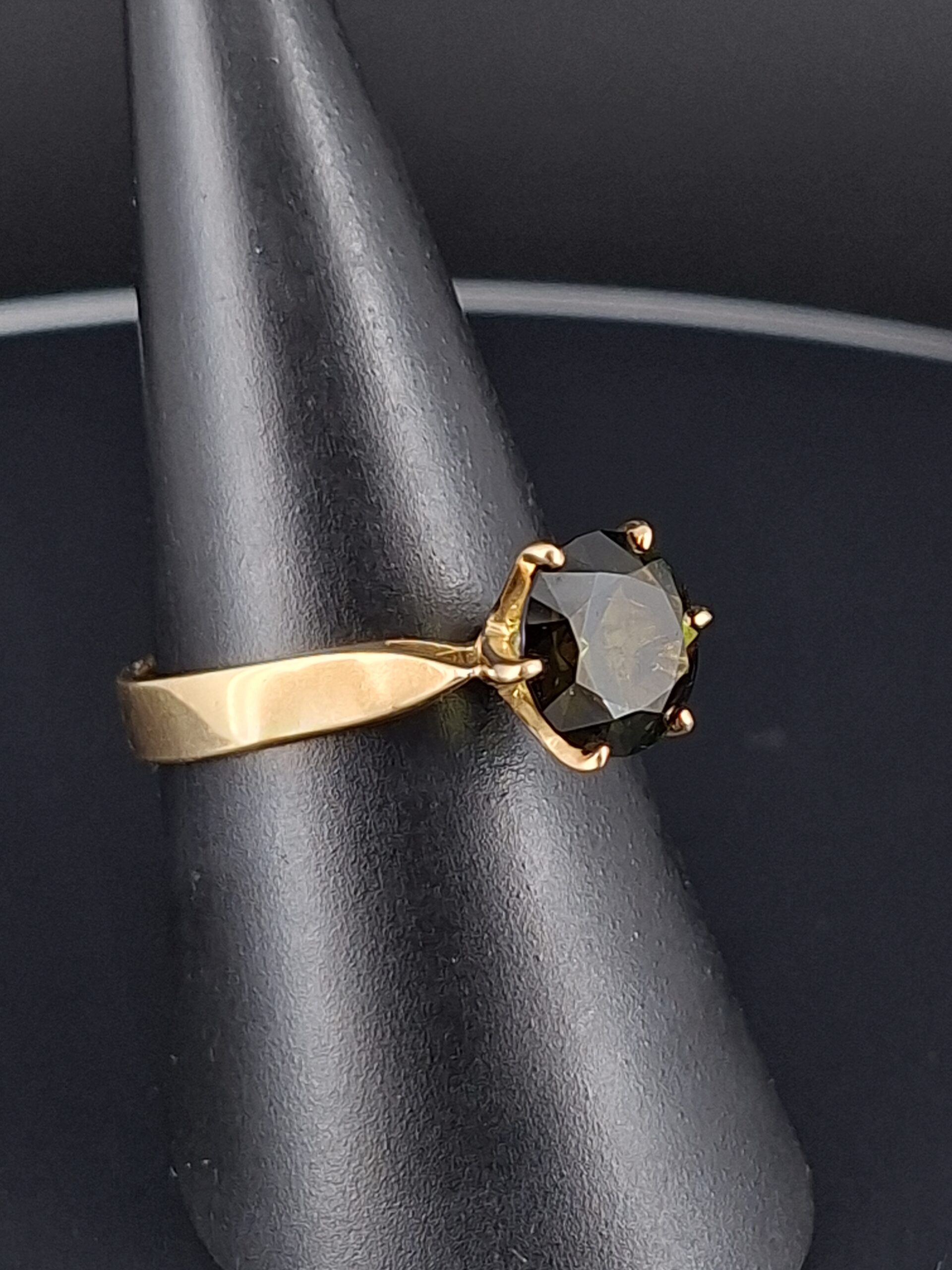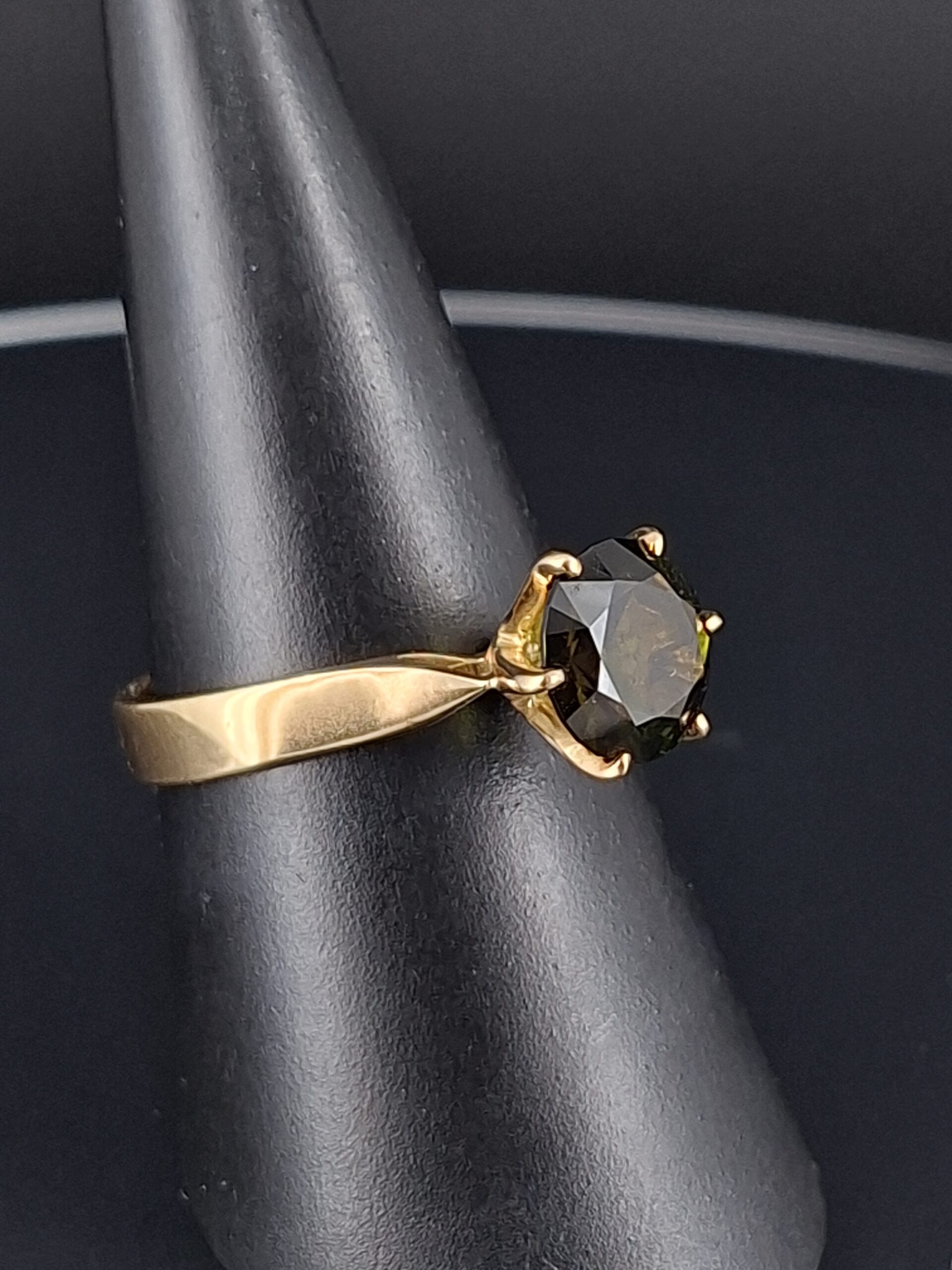 The stunning 8mm gem weighs 1.6 carats and is set in a classic 6-claw Regal setting, crafted from 3.3 grams of 18k yellow gold.